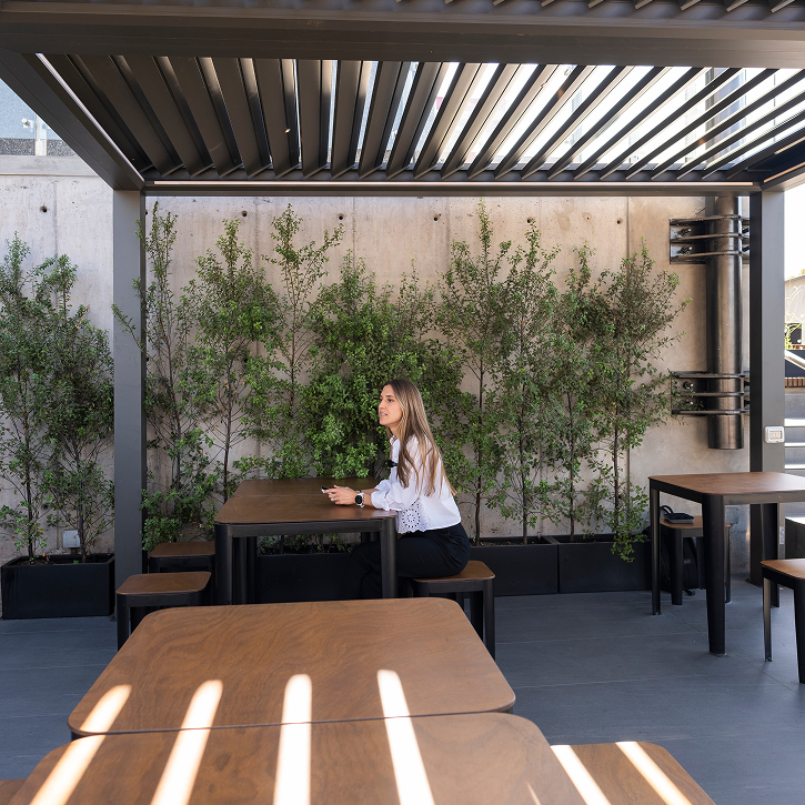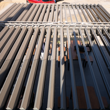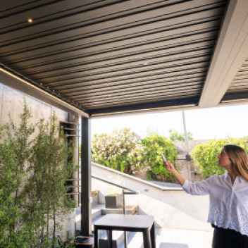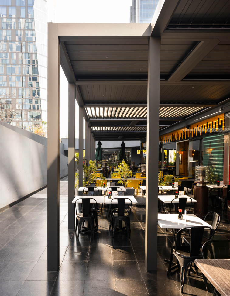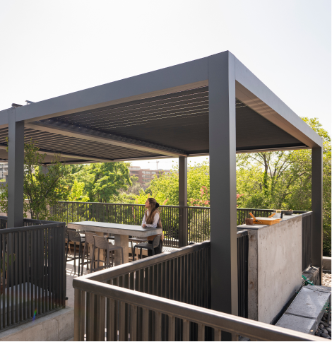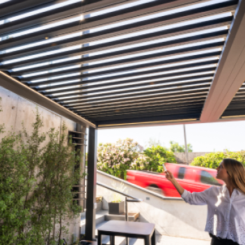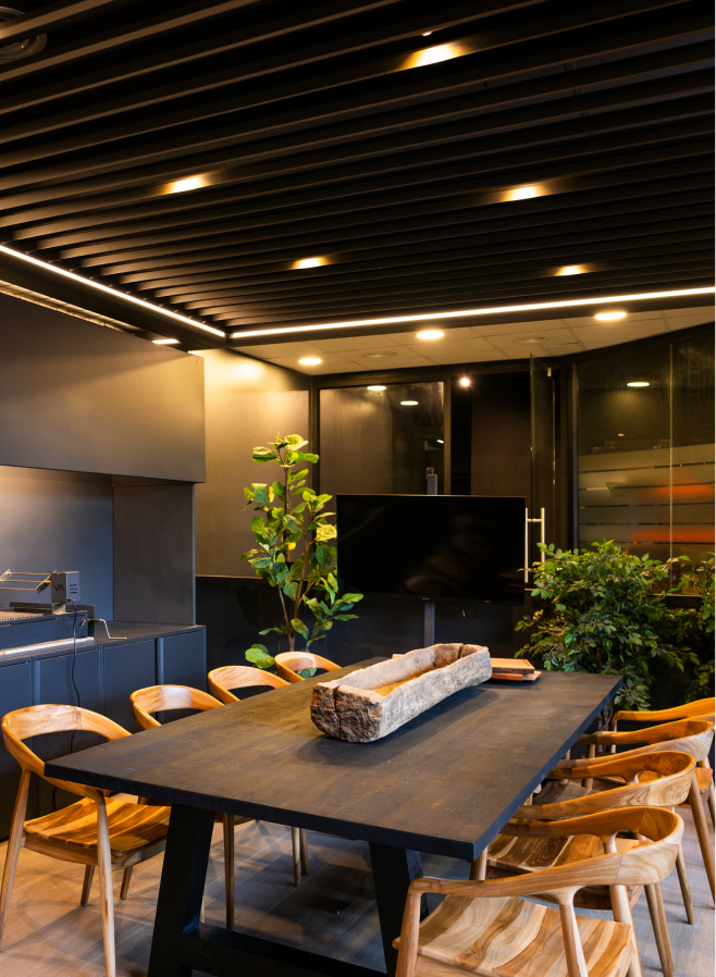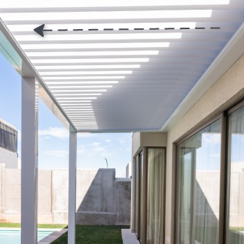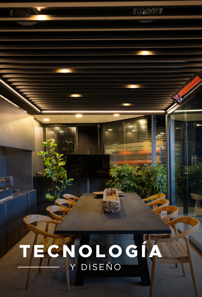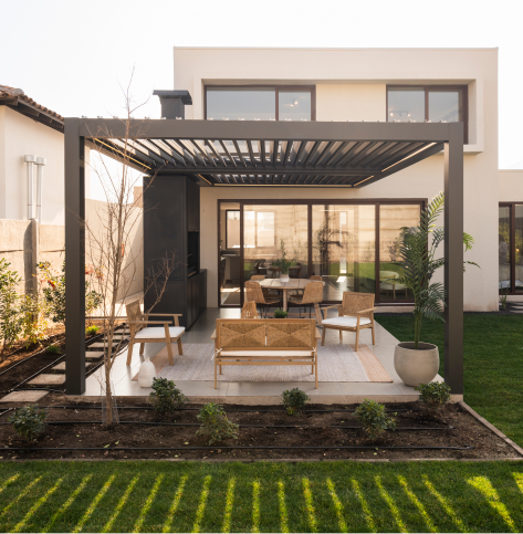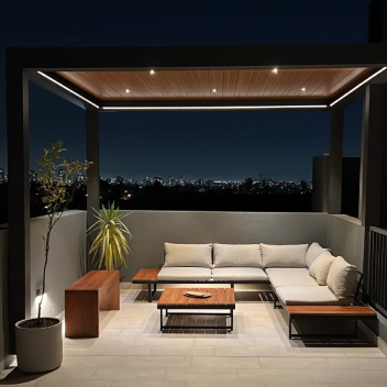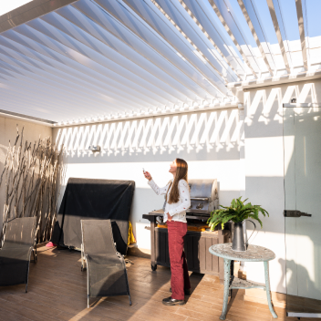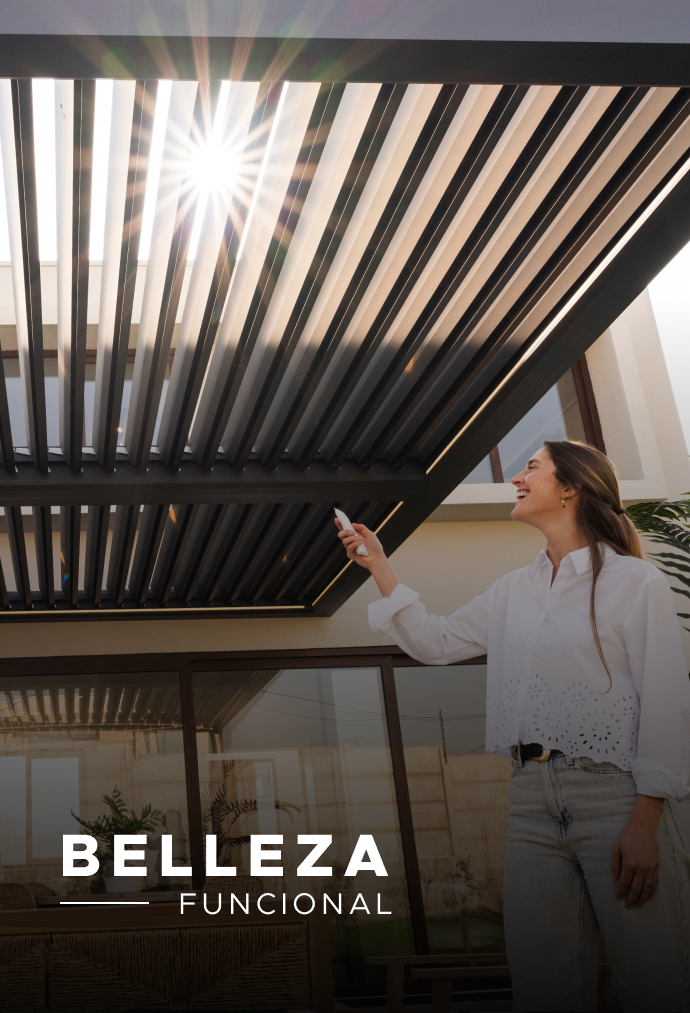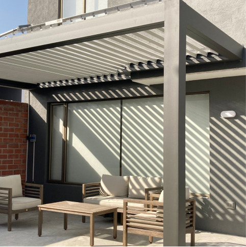 Pérgolas bioclimáticas fabricadas en Chile, diseñadas para terrazas residenciales y comerciales. Su sistema automatizado permite regular la luz, ventilación y protección ante la lluvia.
